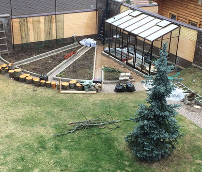 The greenhouse fits into a dwarf wall height of 762mm, and the single door is then dropped into the wall opening to create a low threshold.